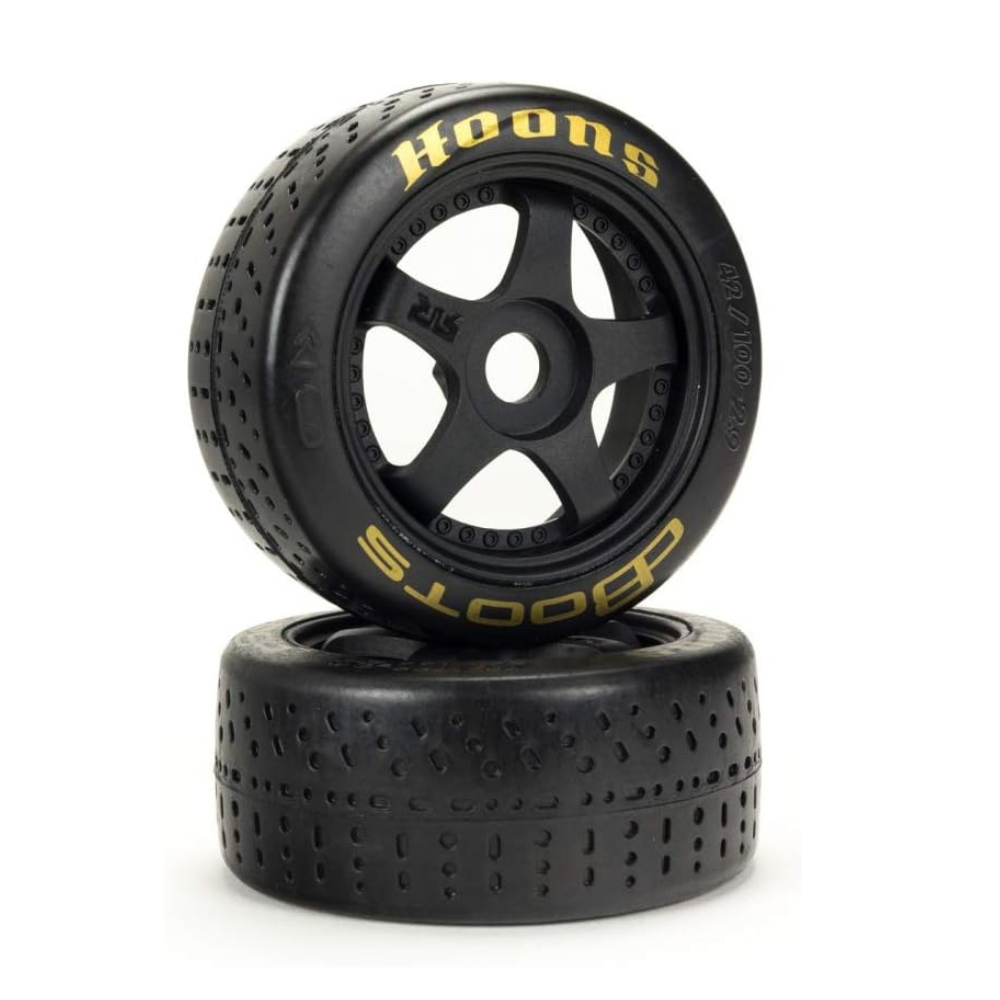 - INCLUDES: 2 x Black Five Spoke Wheels with pre-glued dBoots Hoons tires (GOLD compound)