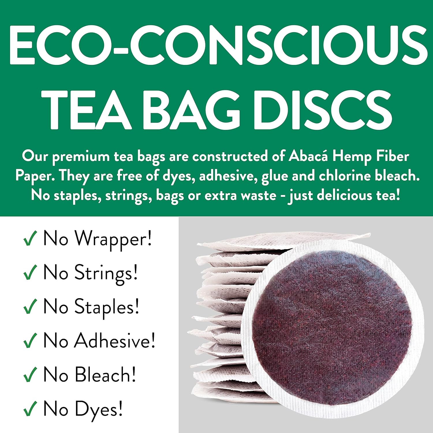 100 ECO-CONSCIOUS TEA BAGS – Our premium tea bags are constructed of Abacá Hemp Fiber Paper. They are free of dyes, adhesive, glue and chlorine bleach. No staples, strings, bags or extra waste – just delicious tea!